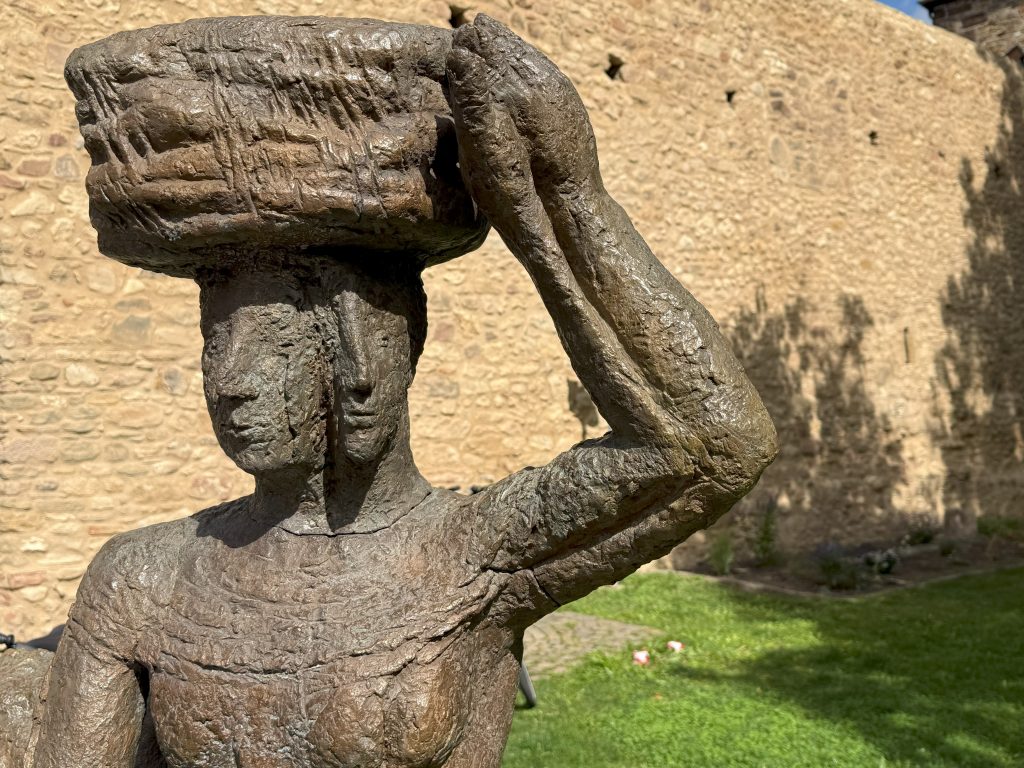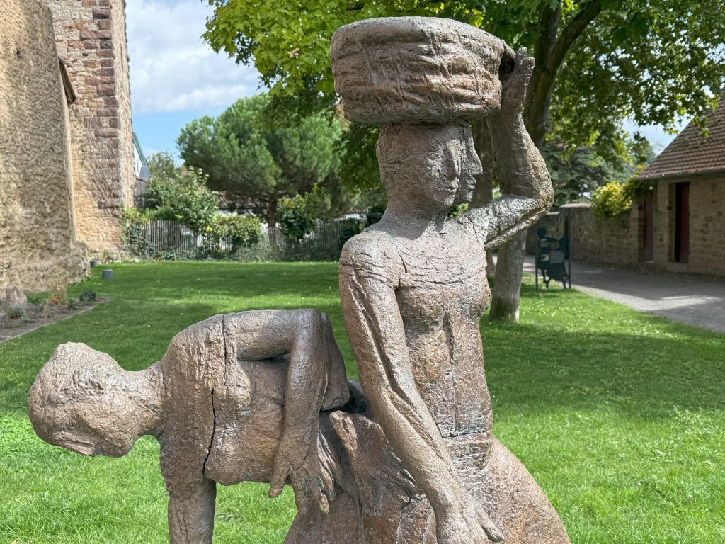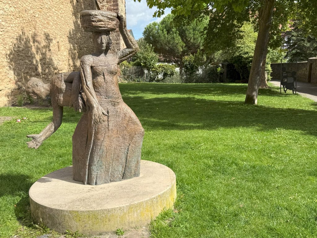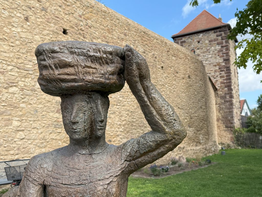 An der südlichen Stadtmauer, dem Bachturm vorgelagert, wird eine vernachlässigte Grünfläche umgestaltet und aufgewertet. Entstanden ist eine Aufenthaltsfläche mit einer nahezu lebensgroßen Skulptur, mit dem Titel „Die Wäscherinnen“ von Herrn Prof. Eberhard Linke (*1937 † 2025). Die Bronze setzt an dem Ort einen besonderen Akzent und erinnert an den ehemals in der Nähe gelegenen Waschplatz Freinsheims.